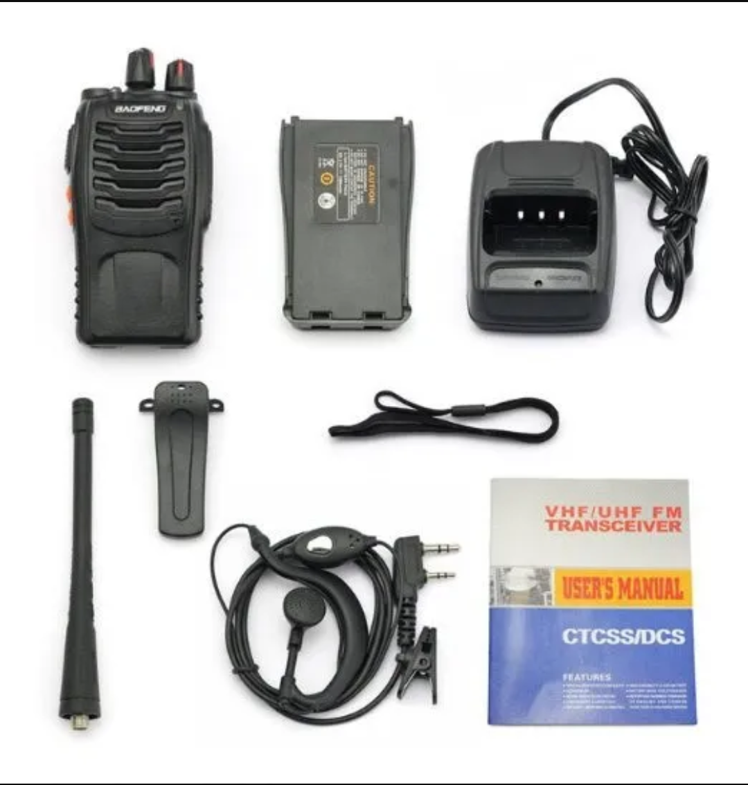 Descripciones básicas Modelo de Walkie Talkie: Baofeng BF-888s Voltaje nominal: 3,7 V CC Potencia de salida: <5 W Capacidad de la batería: 1500 mAh Color: Negro Peso: 180 g Puntos calientes Banda dual o banda única: Banda única Frecuencia doble o frecuencia única: Frecuencia única Rango: UHF: 400-470 MHz Canal de memoria: 16 Linterna LED incorporada Función CTCSS / DCS: Sí Función de escaneo: Sí Función de monitor: Sí Función TOT: Sí Linterna LED incorporada: Sí Función de alarma de emergencia: Sí Alarma de batería baja : Sí Función de ahorro de energía: Sí Mensaje de voz en chino e inglés: Sí Software de PC programable: Sí El bolsillo incluye: 2 x Radio portátil de 2 vías; 2 x antena; 2 x auricular; 2 x paquete de baterías de iones de litio; 2 x cargador de iones de litio; 2 x Clip de cinturón; 2 x el cabestrillo; 2 x manual de usuario.
